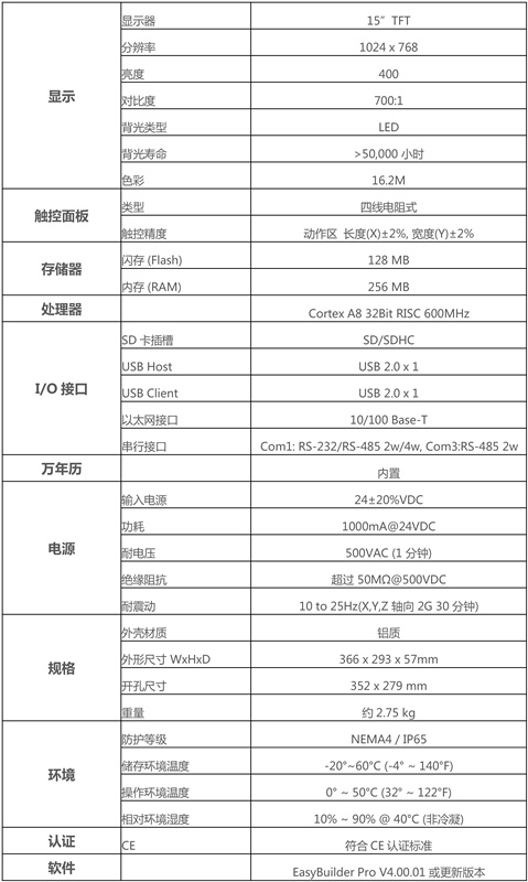 產品特點 Installation 15" 1024x768 TFT LCD, LED 背光 無風扇冷卻系統(tǒng) 內置128MB閃存 支持USB主設備與USB從設備 支持SD卡擴充儲存容量 COM1/COM3 RS485 內置隔離器 COM1及COM3 RS485 2W 支持MPI 187.5K同時間請選擇一使用 內置電源隔離器 NEMA4/IP65 前面板防護等級